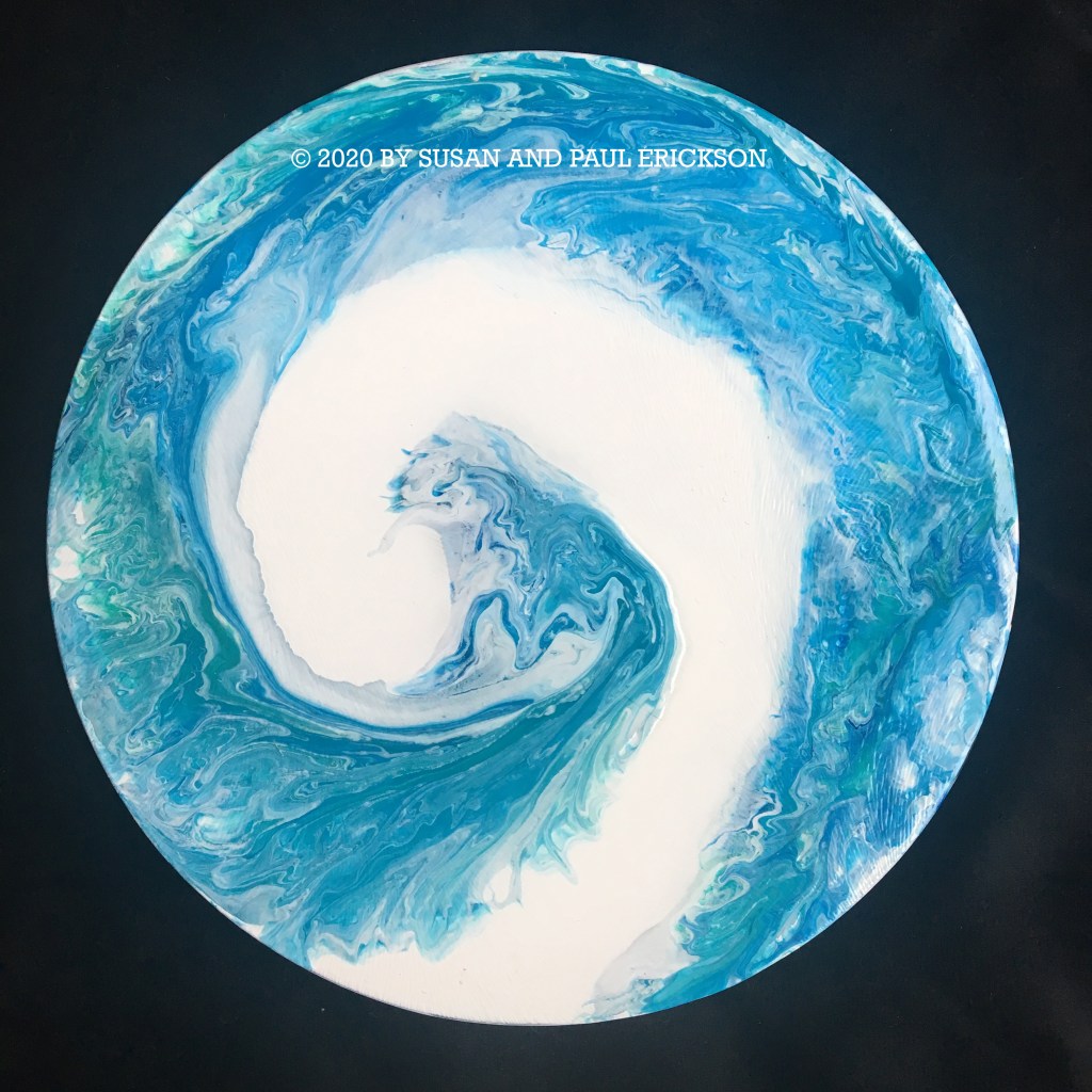 POURED ACRYLIC ART ON GLASS TRIVET © BY SUSAN ERICKSON, 8″ DIAMETER $25 SOLD