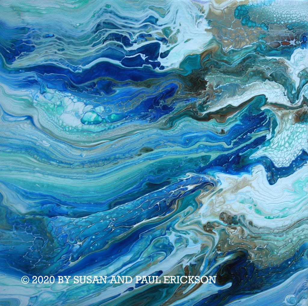 WILD RIVER © BY SUSAN ERICKSON, ORIGINAL ACRYLIC ON CANVAS 12″ X 12″ $50